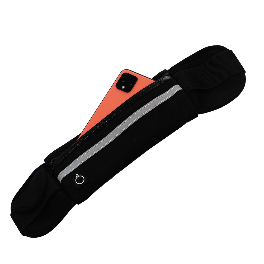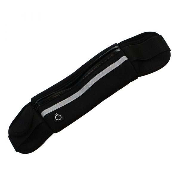 Die sportliche Hüfttasche aus Neopren hat reflektierende Elemente und mehrere Taschen.